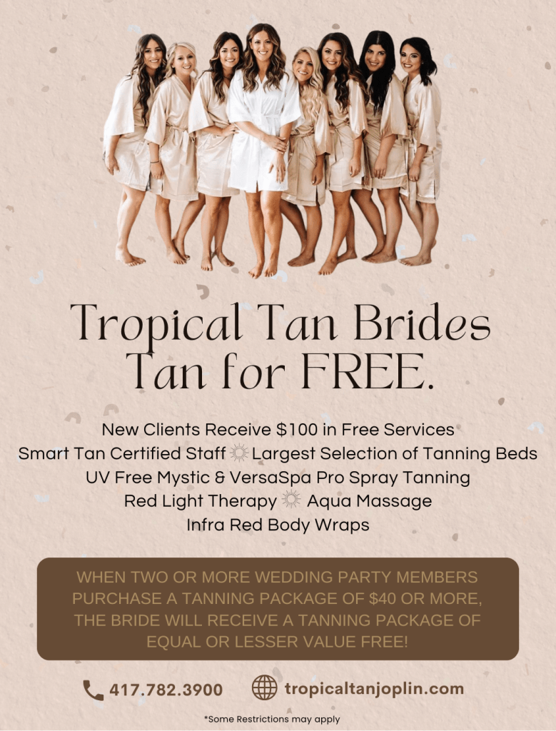 Getting married soon? Beach honeymoon after? Don’t want to blend in with your wedding dress? Grab your bridal party and head over to Tropical Tan, where the BRIDES package is on us when 2 or more bridal party members purchase a tanning package $40 or more.