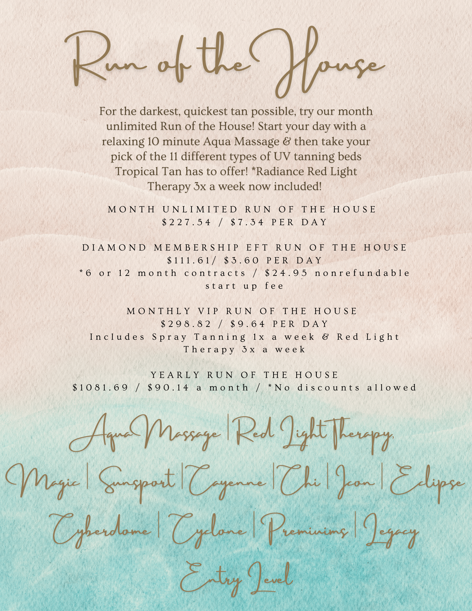 Tropical Tan’s Run of the House is a 30 Day Unlimited in any UV tanning bed + daily Aqua Massage & Radiance Red Light Therapy (3x a week)!