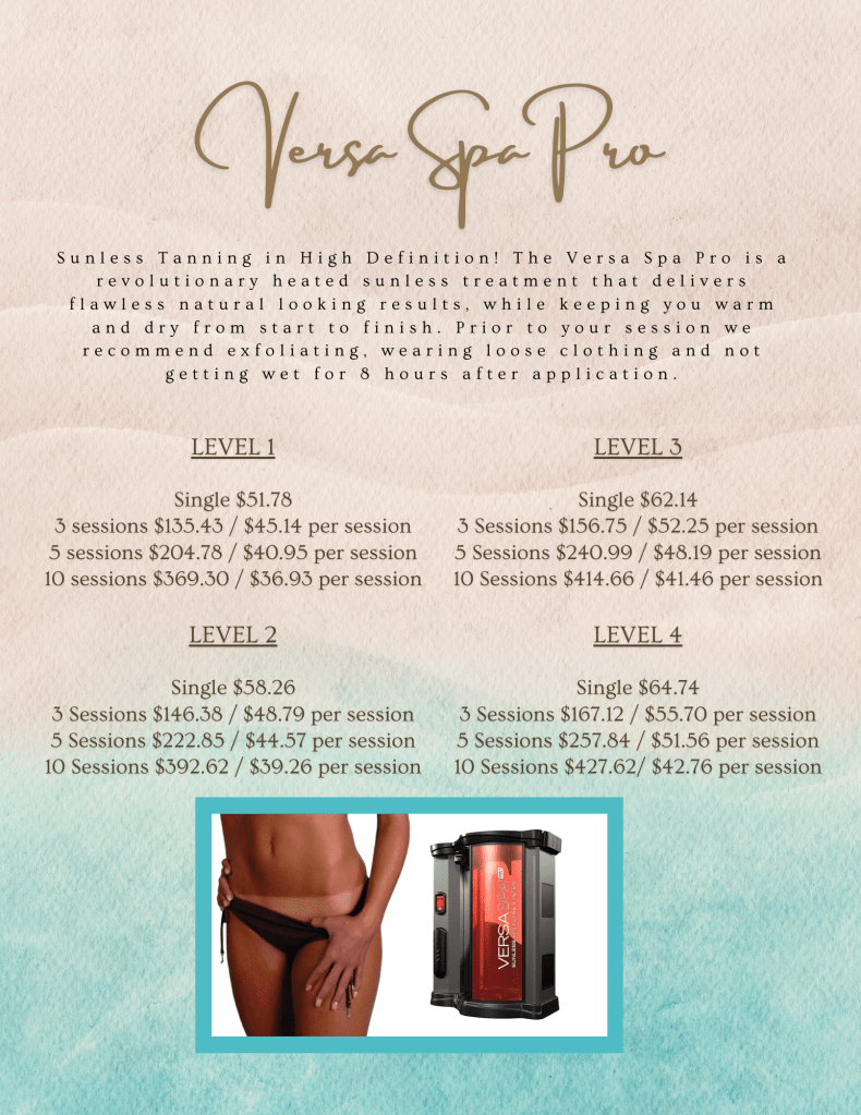 Sunless Tanning in High Definition! The Versa Spa Pro is a revolutionary heated sunless treatment that delivers flawless natural looking results, while keeping you warm and dry from start to finish. Prior to your session we recommend exfoliating, wearing loose clothing and not getting wet for 8 hours after application.