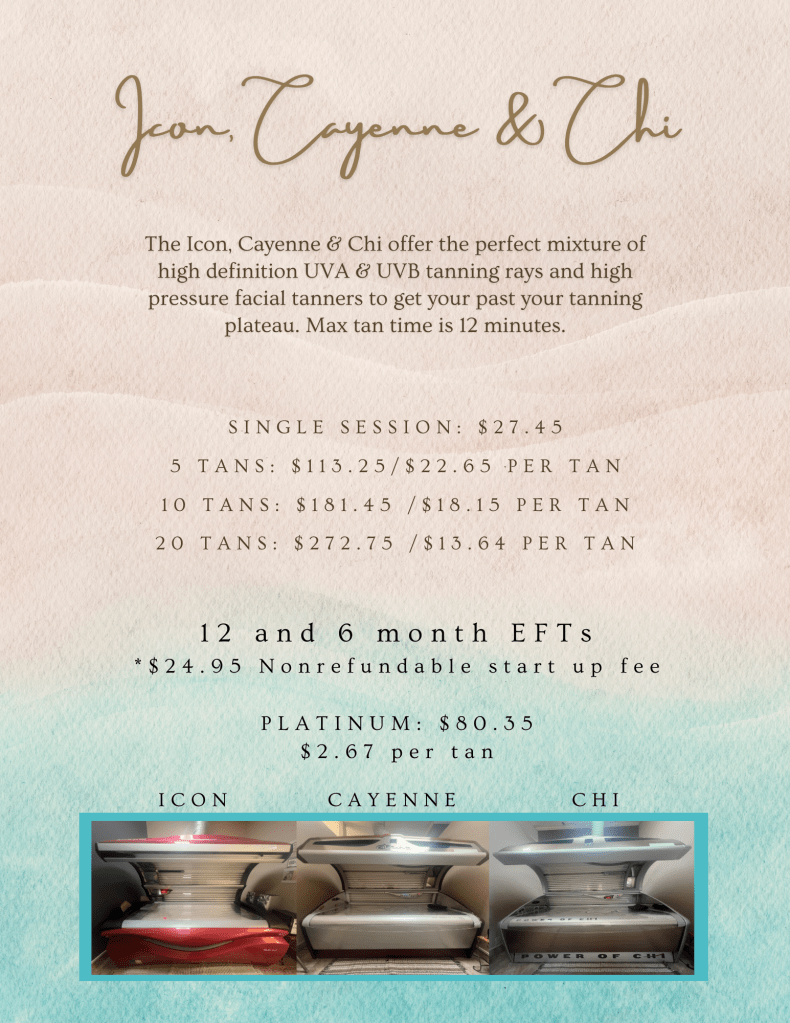 The Icon, Cayenne & Chi offer the perfect mixture of high definition UVA & UVB tanning rays and high pressure facial tanners to get your past your tanning plateau. Max tan time is 12 minutes.